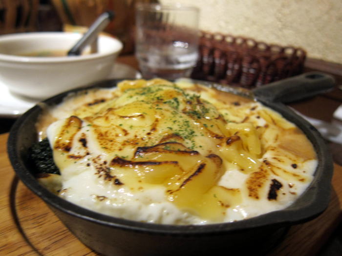 「ハンバーグ100g グラタン 800円」ホワイトソースたっぷりのグラタンにかくれて真ん中にはジューシーなハンバーグがあるボリュームたっぷりの一皿です。パンかライスが選べます。