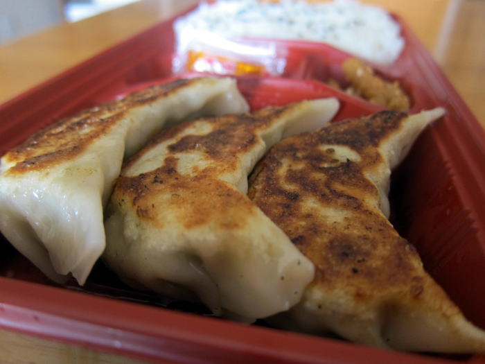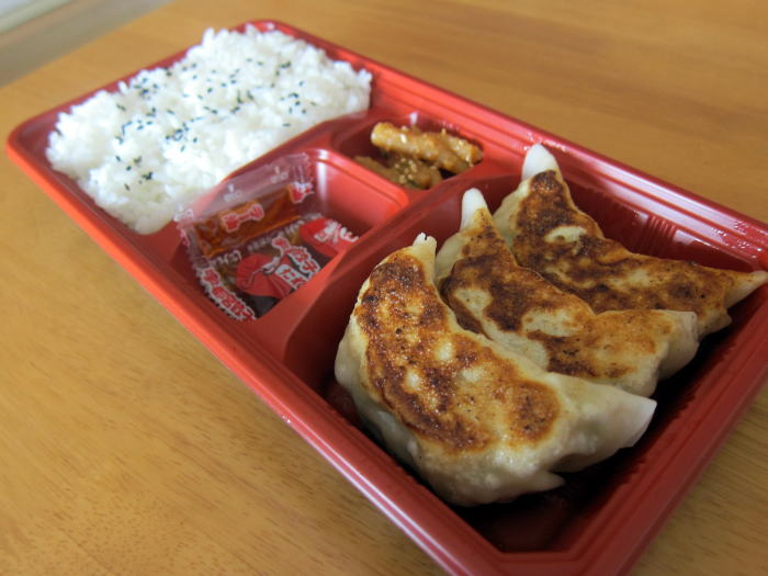 ジャンボ餃子が3つ入って、おいしいごはんも山盛りなこのお弁当で600円でした。食べておいしくできたての宇都宮餃子に満足しました。