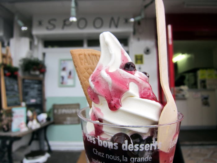 ふんわりしたチーズムースの上においしいソフトクリームがたっぷりとのっていて、まわりのブルーベリーのソースとよくあいます。