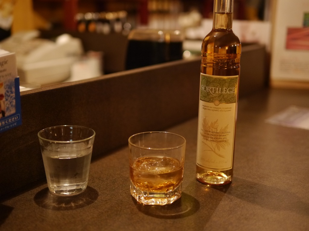 メープルウィスキー ロックでいただきました。もちろんカナダのケベック州産、カナディアンウィスキーとケベック州のメープルシロップたっぷりのリキュールです。