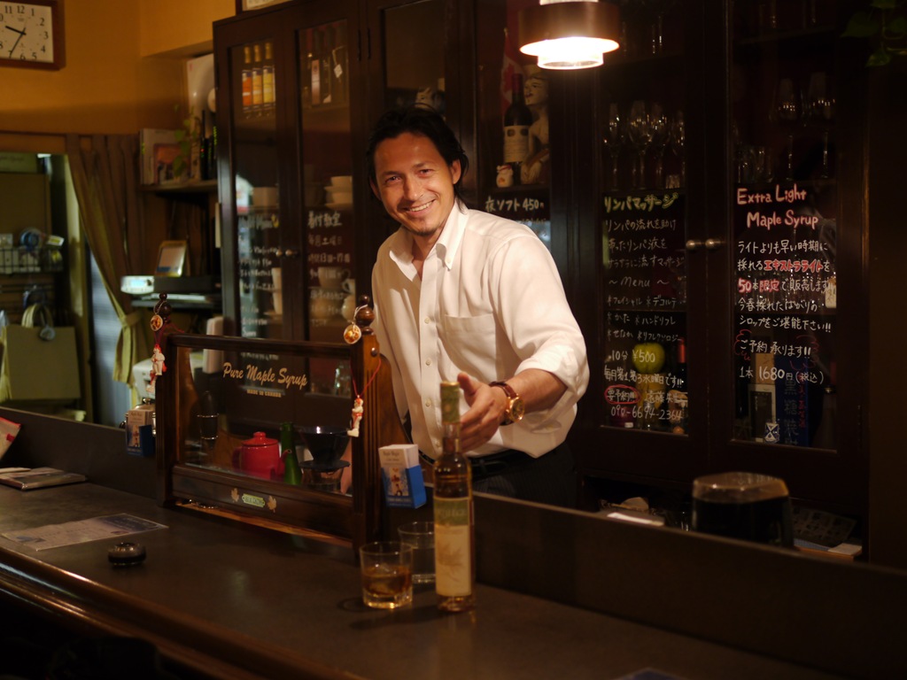お店には店主のギャニオンさん、明るく迎えてくれました。この日のお目当ては、楽しみにしていたメープルウィスキー