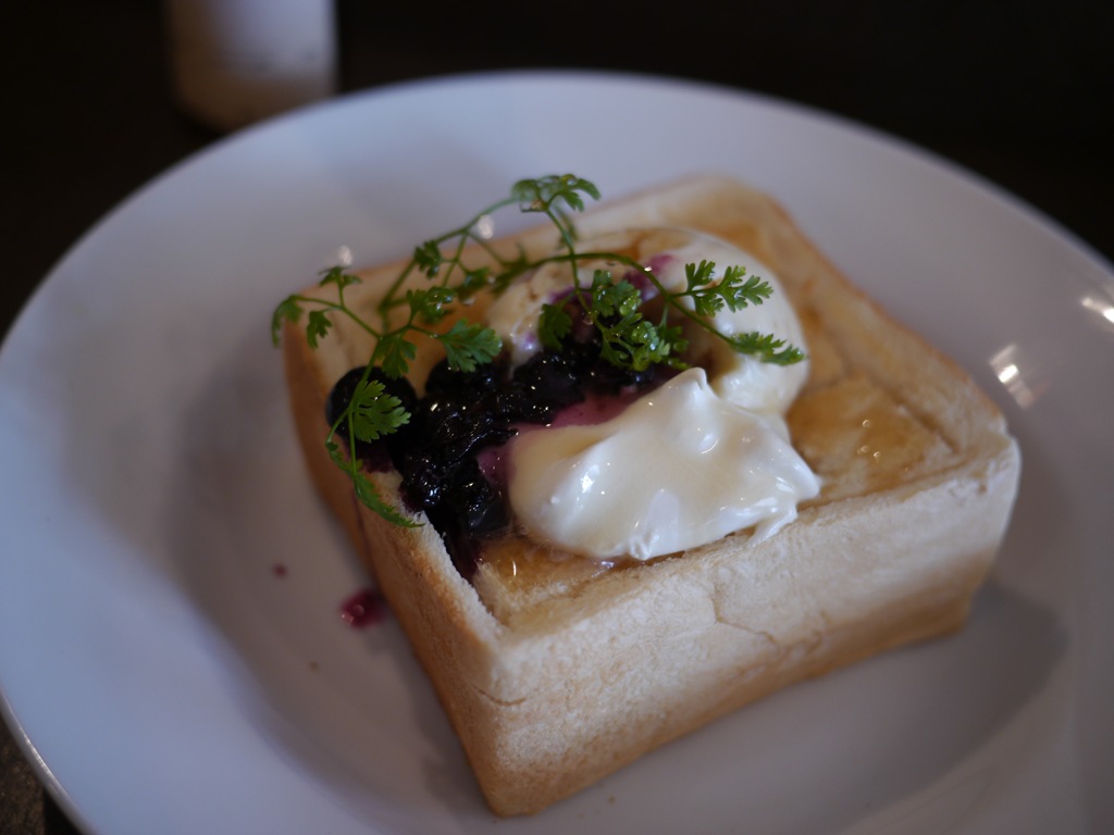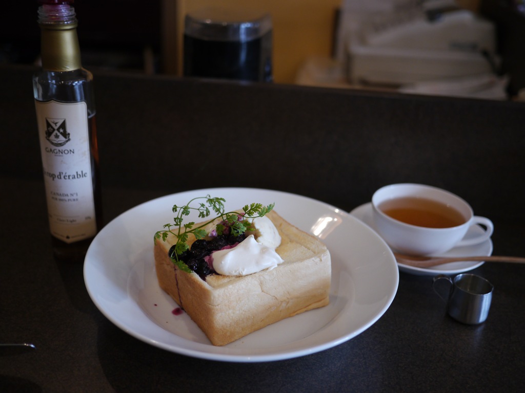 メープルトースト 厚切りのトーストの上にはクリームとジャム、カナダのメープルシロップを好きなだけかけていただきます。一緒にたのんだのはメープルドリンク