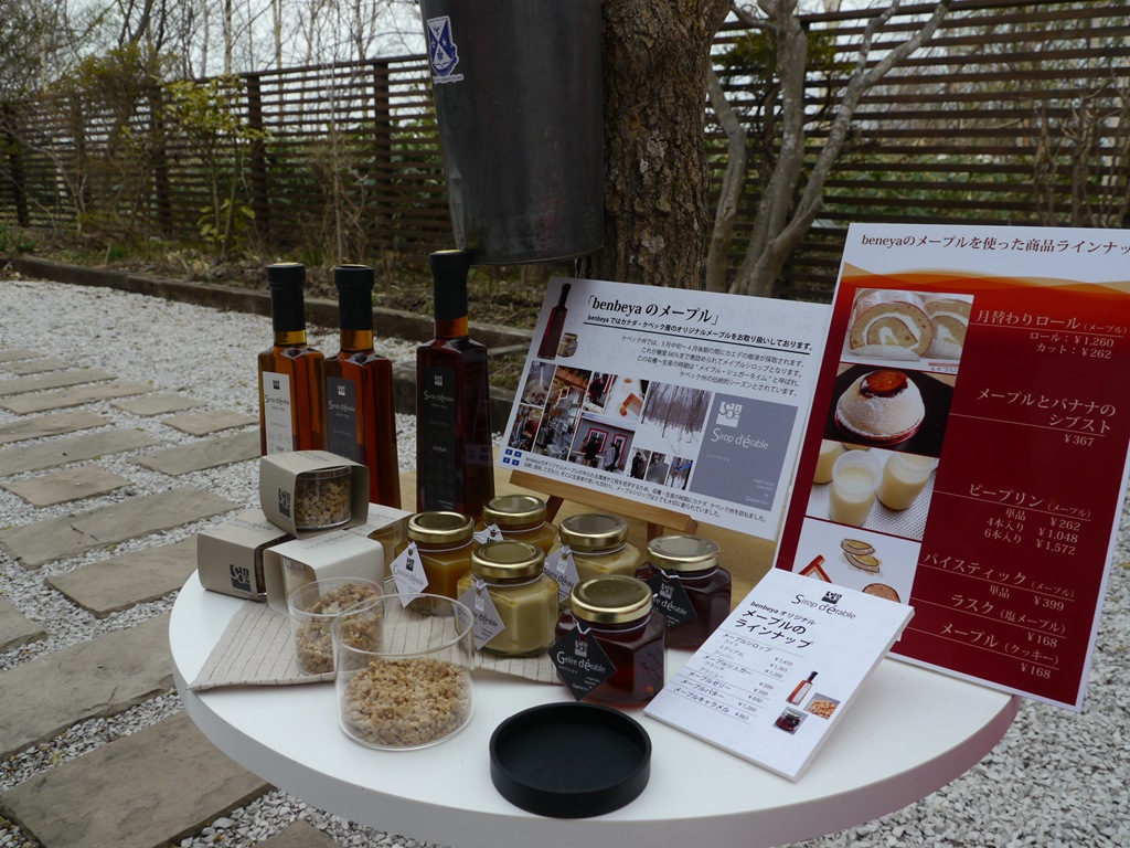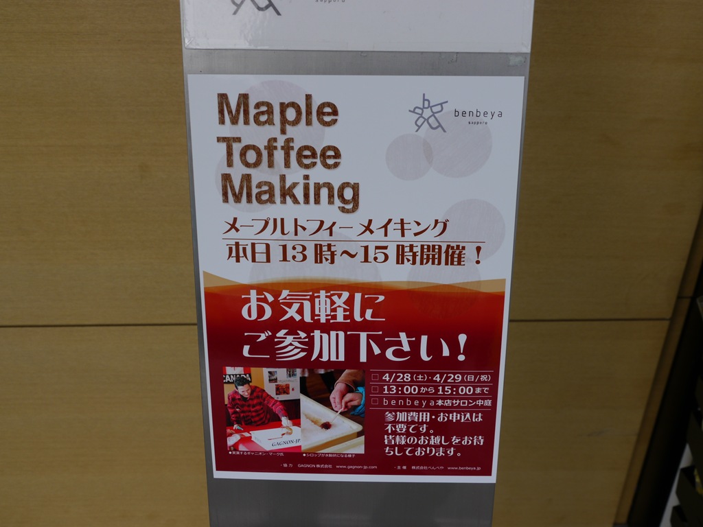 お店のチラシをみると、ゴールデンウィークの4月28日、29日に手稲区のbenbeya(ベンベヤ)でメープルトフィーメーキングというイベントが開催されるそうです。メープルトフィーとは雪の上に煮詰めたメープルシロップをたらして、水飴状になったものを棒に巻き付けて食べるカナダのお菓子だそうで、GAGNON代表のカナダ出身のギャニオンマークさんが実演してくれるそうです。