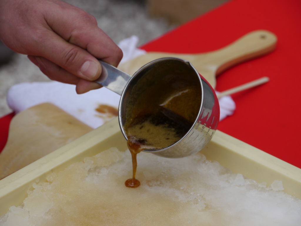 煮詰めたメープルシロップおいしそう、冷たい氷の上でとろっと固まります