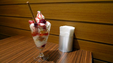 娘がアイスを食べたいということで向かったのが札幌駅地下にあるホワイトコージよつ葉です。パセオ地下にはトーティラフラットやハゲ天など、個性的なお店が多く楽しめます。「パセオ」という言葉はスペイン語で散歩道という意味だそうです。パフェもいろいろな種類があり迷いましたが4種のベリー&ベリーのパフェ780円をお願いしました。