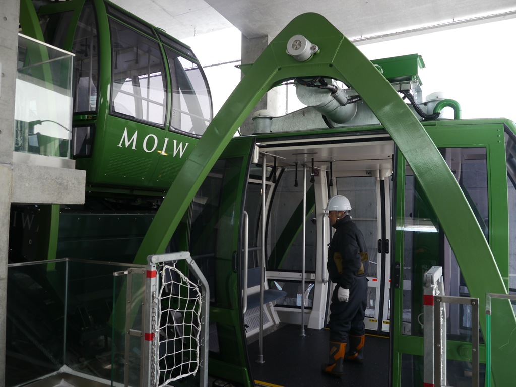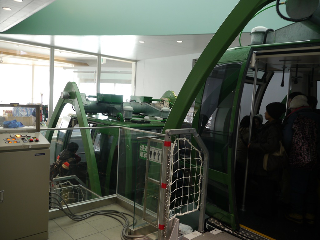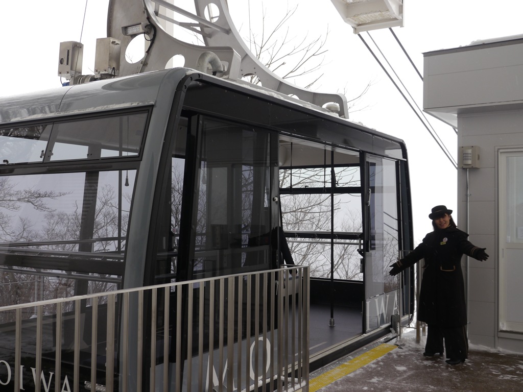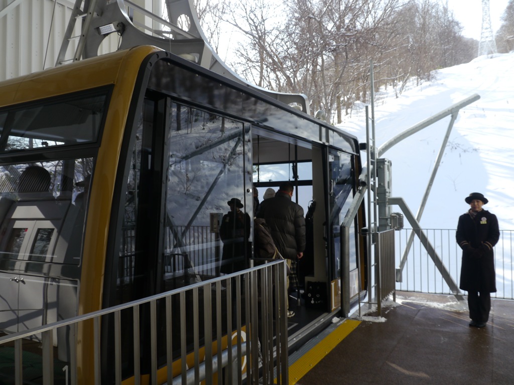 いよいよ新しいロープウェイに乗り込みます。窓が広く、バリアフリーの設計でモダンなデザインでした。4分56秒の空中散歩です。オレンジのゴンドラは蝦夷栗鼠という名前がついています。