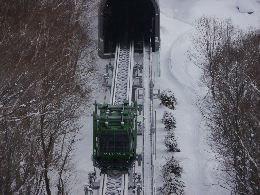 ロープウェイを降りて、もーりすカーに乗り込みます。もーりすカーは世界初の森林体験型の身にケーブルカーだそうで、藻岩中腹駅と藻岩山頂駅を1分45秒で結びます。
