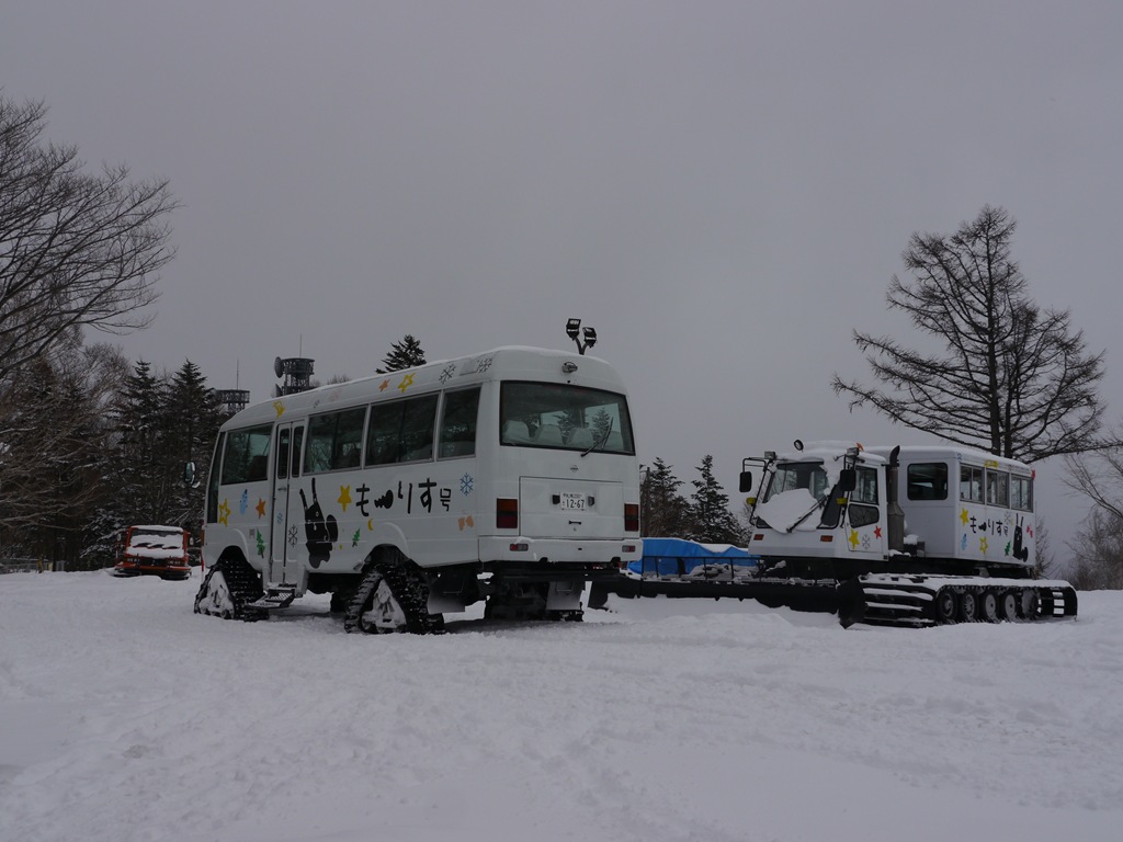 山頂駅から下を見ると、もーりすカーが降りていました。ユーモラスな親しみのわく乗り物です。