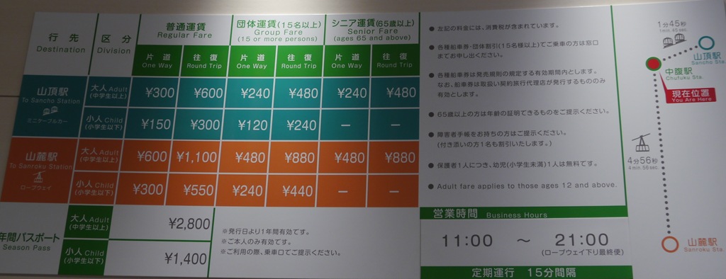 料金表を見ると、年間パスポートは2800円、通常ロープウェイ1100円とモーリスカー600円の往復1700円かかることを考えると1年に2回以上乗るとしたら、年間パスポートはかなりお得です。この日は700円割引クーポンを使ったので1000円でした。