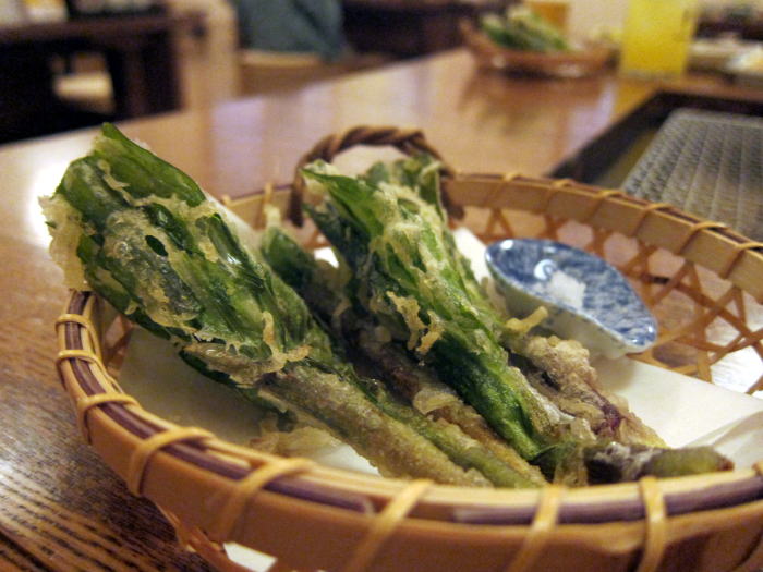 最初に揚げたてのアイヌネギの天ぷらが出てきました。八雲の粗塩で食べましたが、風味よくおいしくいただきました。