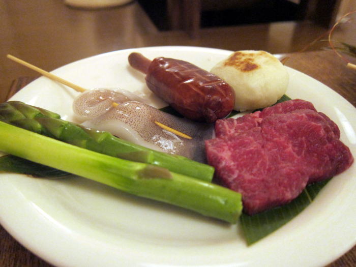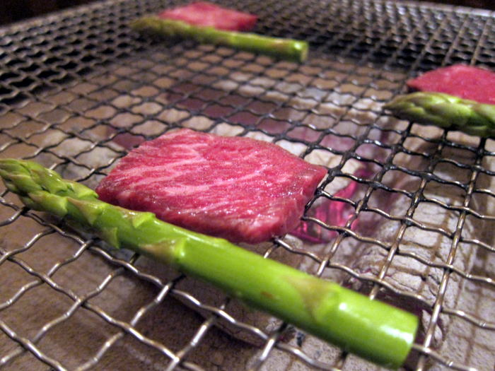 最初に囲炉裏で焼いたのは、名物の八雲和牛と、春とてもおいしいアスパラを焼きました。どちらもとても美味しくて満足です。