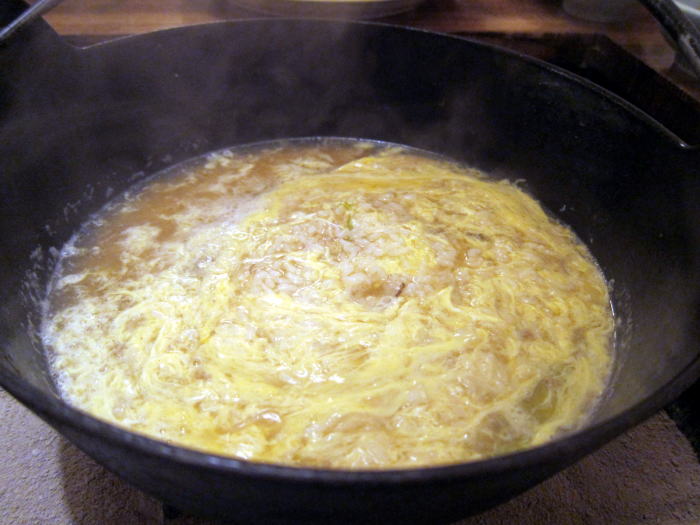 囲炉裏は2つに分かれていて右の鉄鍋には名古屋コーチンの鶏鍋がセットされました。