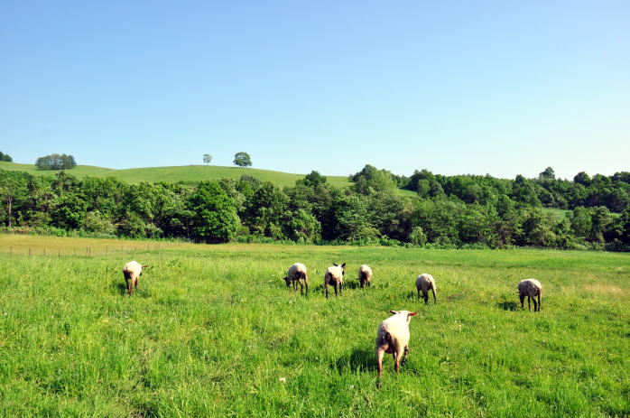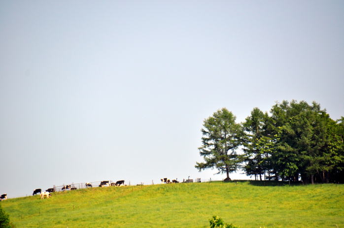 菜種の畑の上には景色のいい丸加高原があります。ここには黄色い畑はありませんが、羊がゆっくりと草をかんでいます。5月末に菜の花畑を巡る10kと8kのフットパスがあるということでめぐってみたいと思いました。