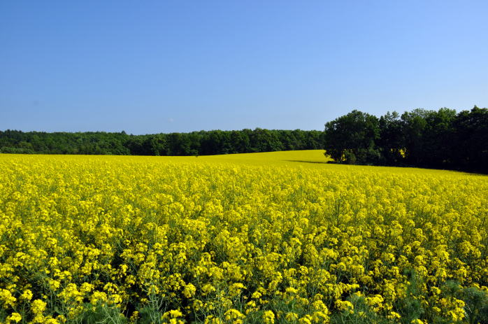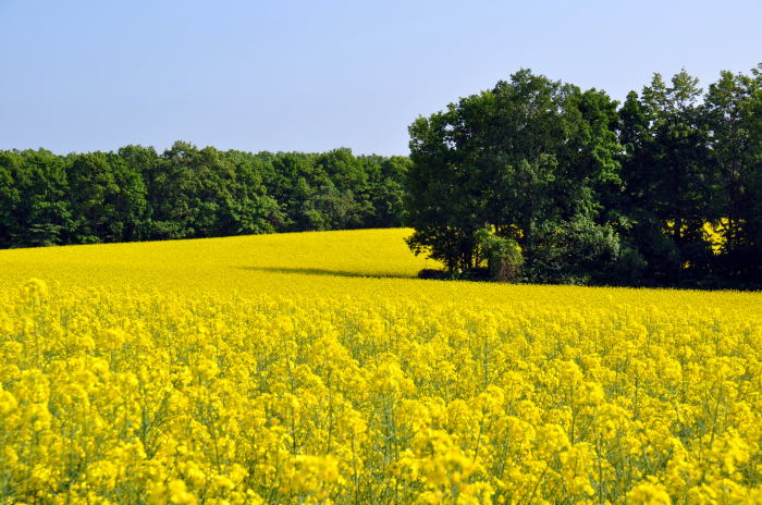 きれいな田園風景と鮮やかな黄色い菜の花があっています。