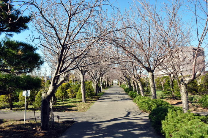 フゲンゾウという種類の桜がみごとな通り道をつくっています。さぞや咲いたらきれいだろうと想像してしまいました。5月9日にうかがいましたが、桜はまだ小さなつぼみでした。
