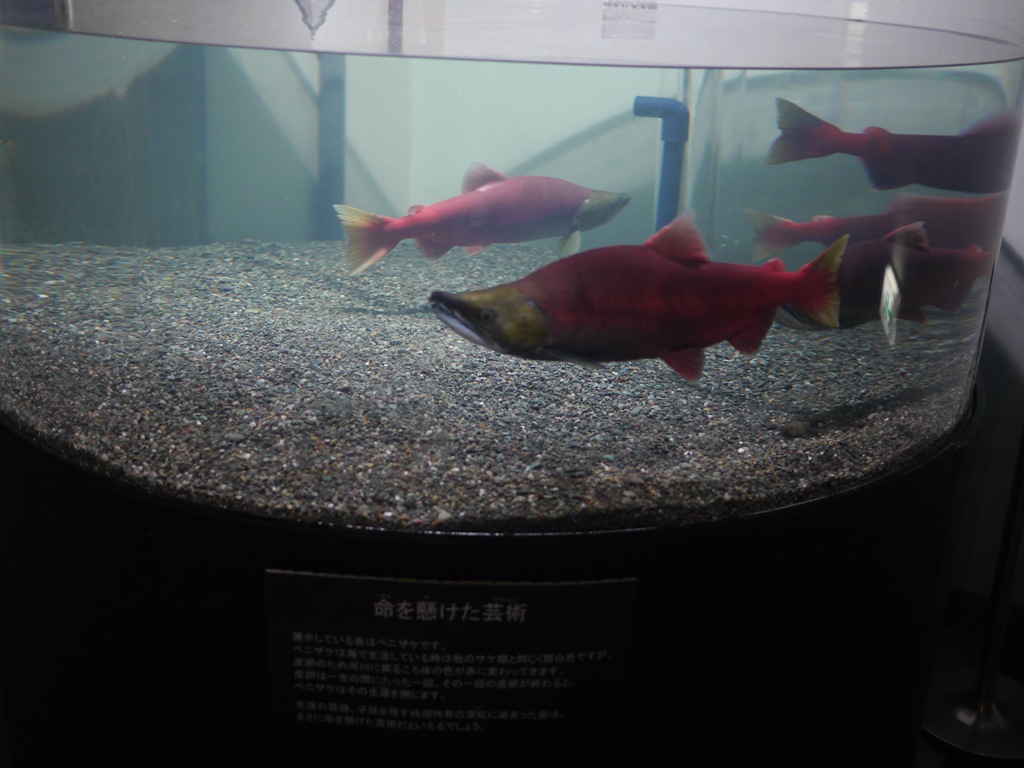 秋を感じる、ベニザケの展示がありました。とてもきれいな赤、秋らしい色合いにびっくり。
