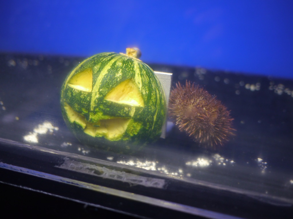 一番驚いた光景は、高級食材のエゾバフンウニがはろうぃーんかぼちゃを食べている水槽です。バフンウニ、昆布以外にもかぼちゃやにんじんいろいろもりもり食べます。