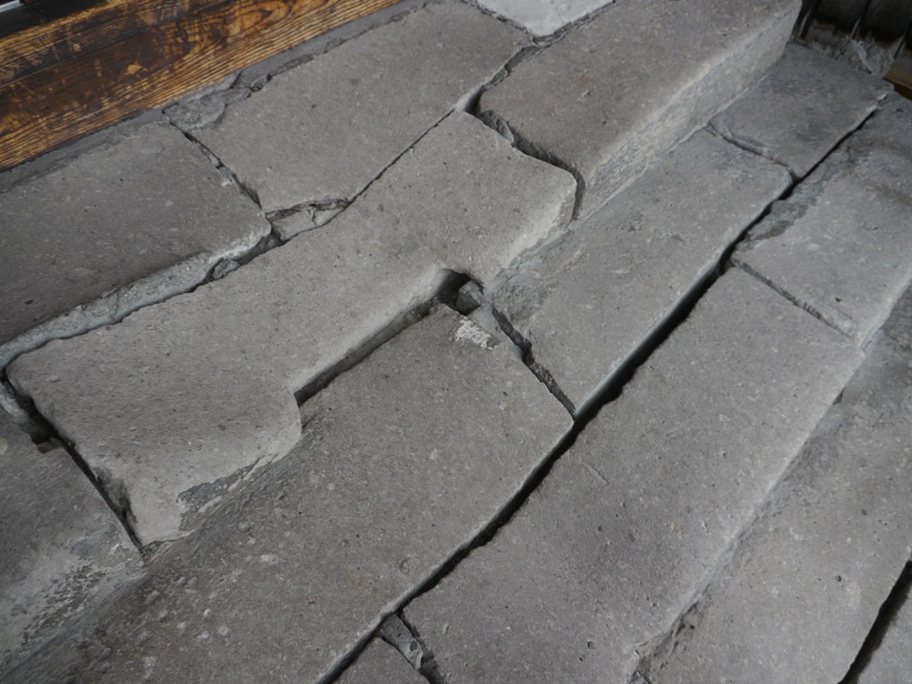 入り口の石階段、囚人達が足につけていた鉄丸のためえぐれています。