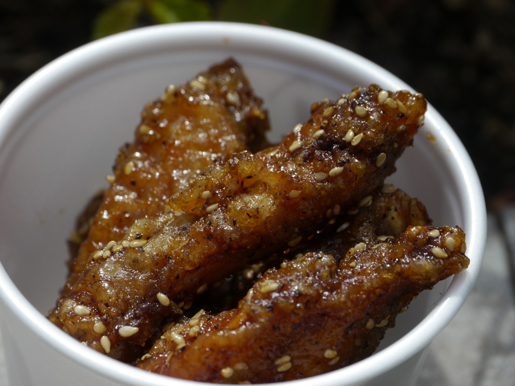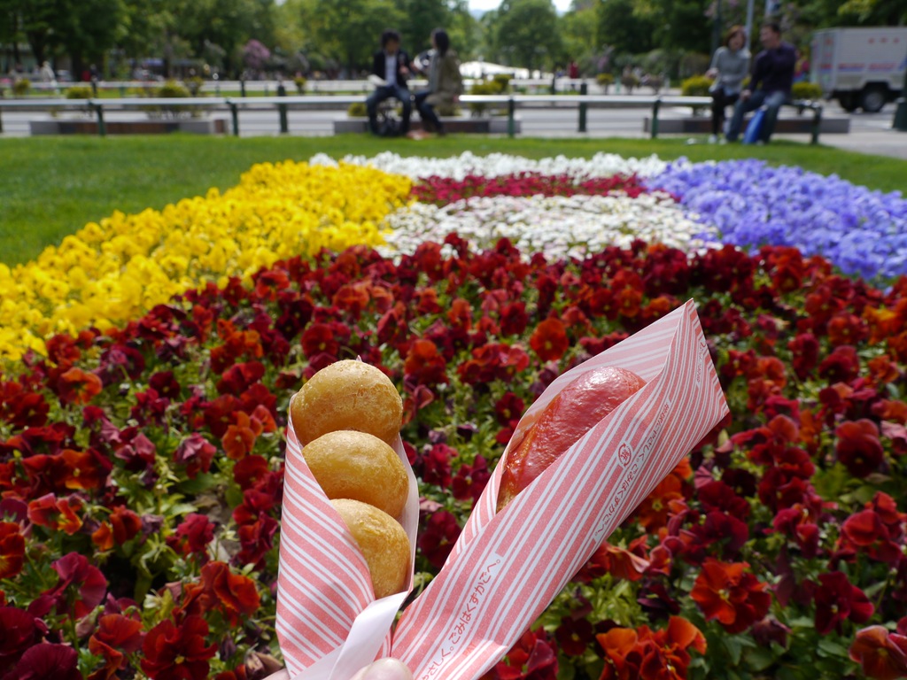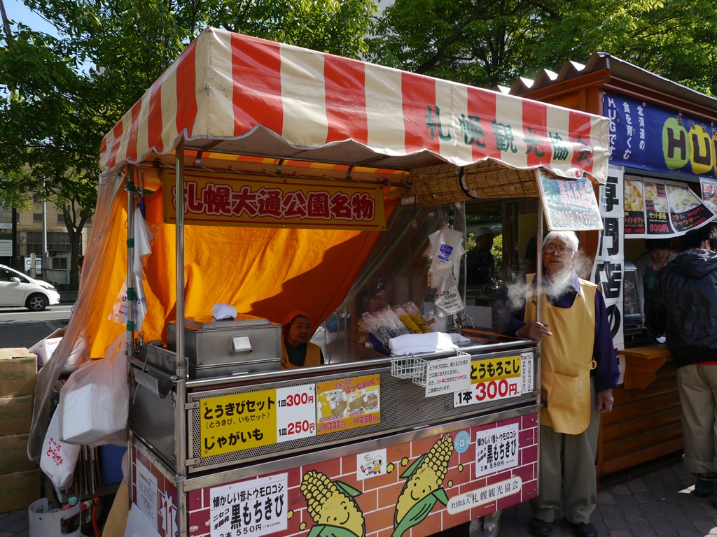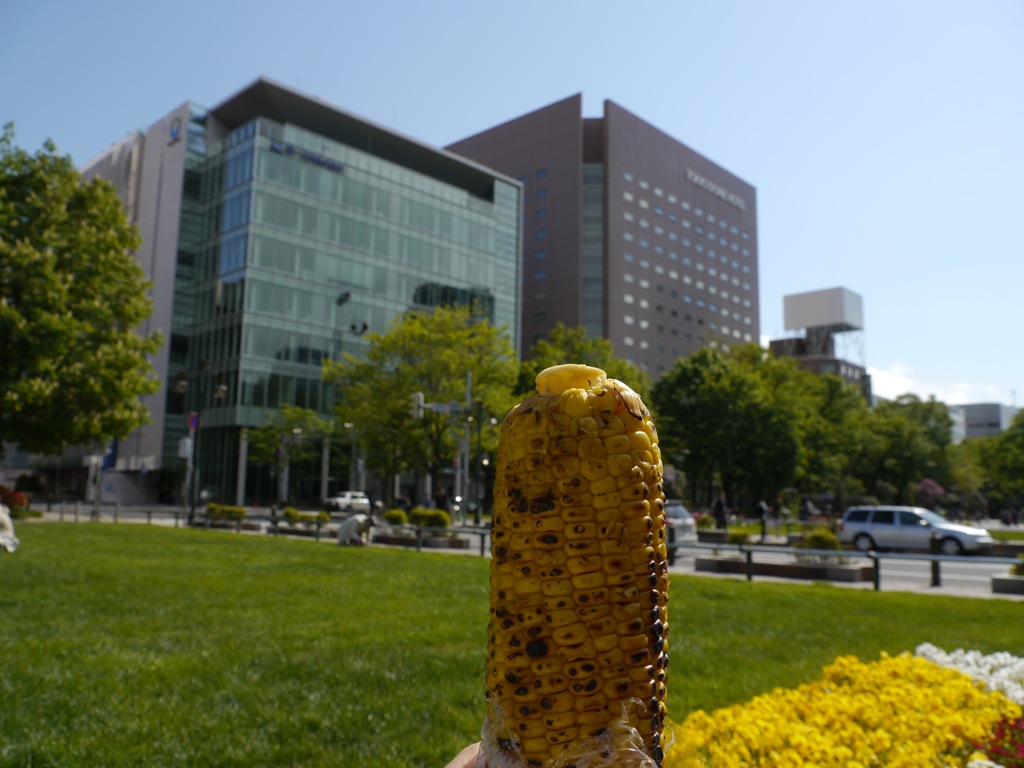 大通公園でかかせないのが、とうきび屋台、焼きトウキビを一本購入しました。