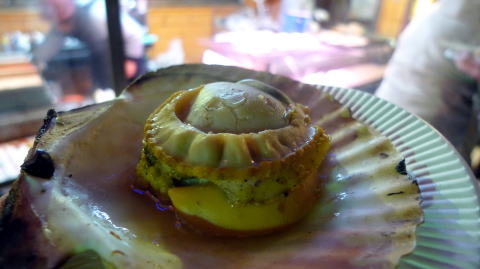 ホタテ焼き この時はタイムセールで200円で味わいました。4年ものの身厚のしっかりしたほたてです。