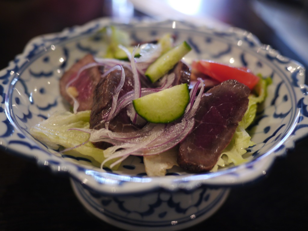 国産牛の網焼きサラダ 450円 興味深い新メニューがいろいろあって、迷いながら注文しました。分厚く切った国産牛がとてもジューシーでおいしい。タイの「ヤムヌア」という料理だそうです。味付けがとても爽やかで食欲を増す一品