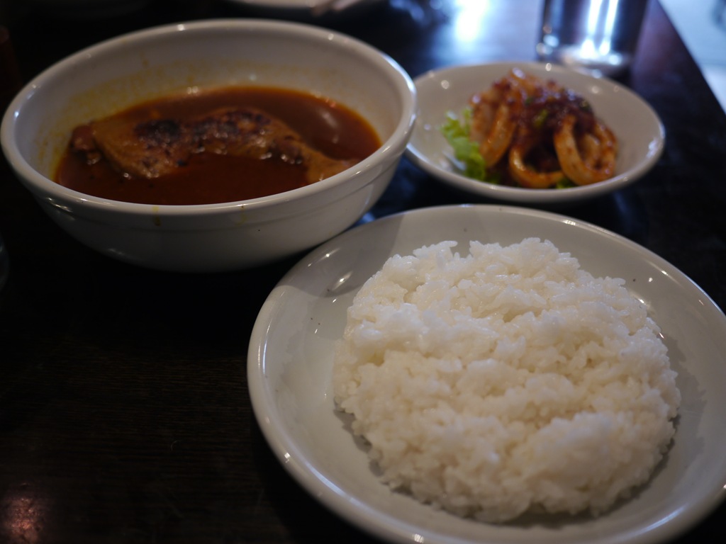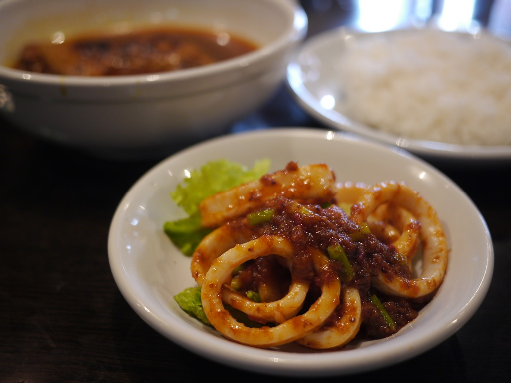 イカとにんにくの芽の自家製サンバルソース炒め 280円 これはとてもおすすめ、干しエビたっぷりでおいしいサンバルソースをごはんに混ぜてスープカレーをかけるとうまみ倍増、さらにいかものせてスープカレーをかけると、よくあいます。たのんでうれしい一皿でした。この一皿、とてもおすすめです。
