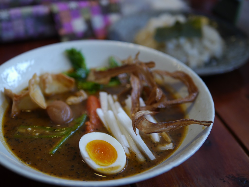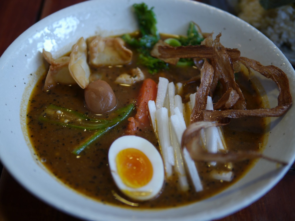 ササミ、梅肉、山芋、オクラ、なばな、ゴボーチップ、チーズ餃子、梅干し、たまご食べる前は、スープカレーと梅干しの取り合わせが合うのかと思っていましたが、とても食欲をそそるおいしい取り合わせ、らっきょのおいしさたっぷりのスープにぴったりの取り合わせでした。