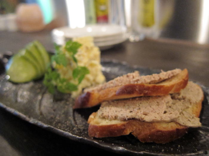 とても種類の多い、食事メニューを眺めていて、何にしようか迷っていると、軽く盛り合わせにしますかと言われてお願いしました。レバパテ、ポテトサラダ、きゅうりのピクルスです。