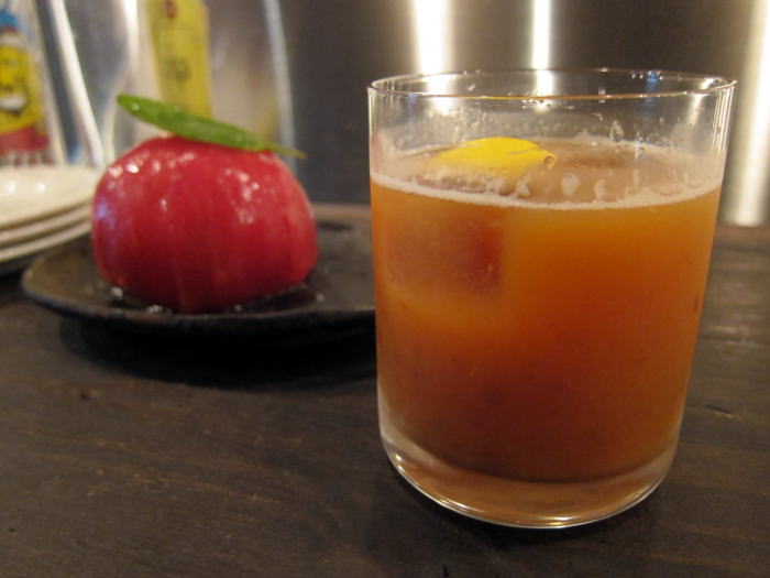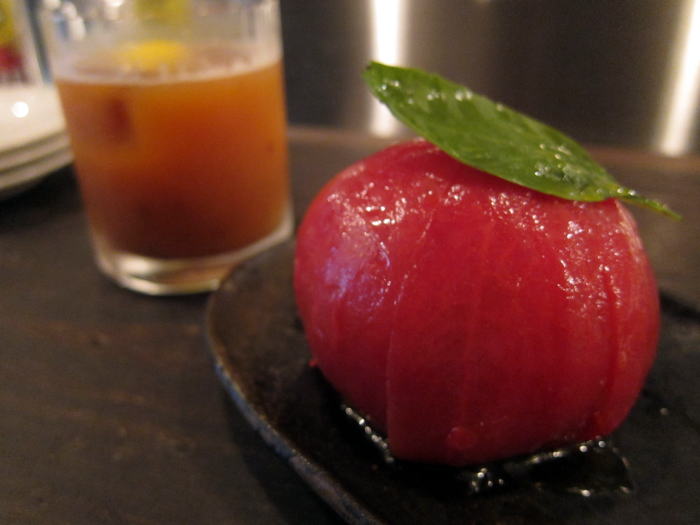 プルーンのサングリアとともにお願いしたのは「冷製49トマトサラダ490円」みるからにみずみずしいおいしいトマトで、さすがに49の名前のついたトマトサラダということで、作るときも真空で1日寝して隅々にうまみが浸透しているおいしいトマトでした、ひんやりとしたトマトはバジルとともに食べると、なんともいえないおいしさでした。