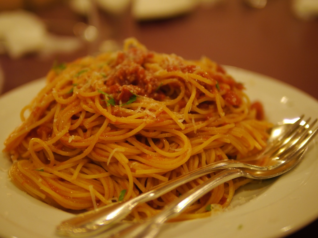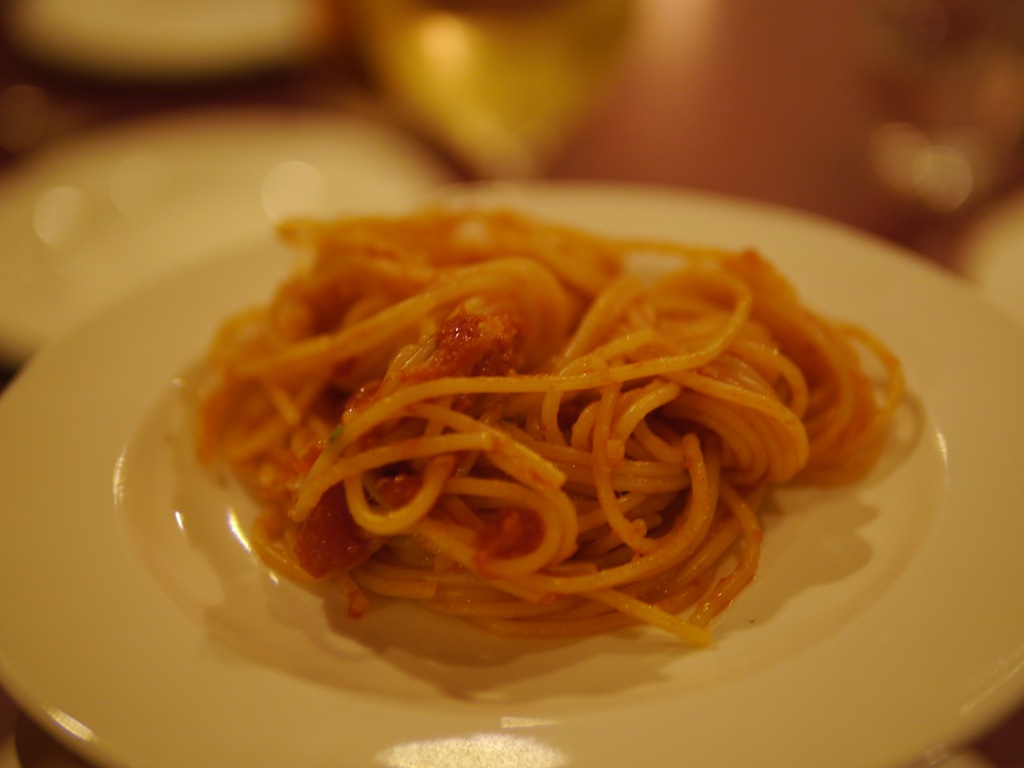 うれしいことにもう一品、テーブルに大皿にもられたパスタが運ばれました。トマトたっぷり、辛みが夏に食欲を刺激するおいしいパスタ。