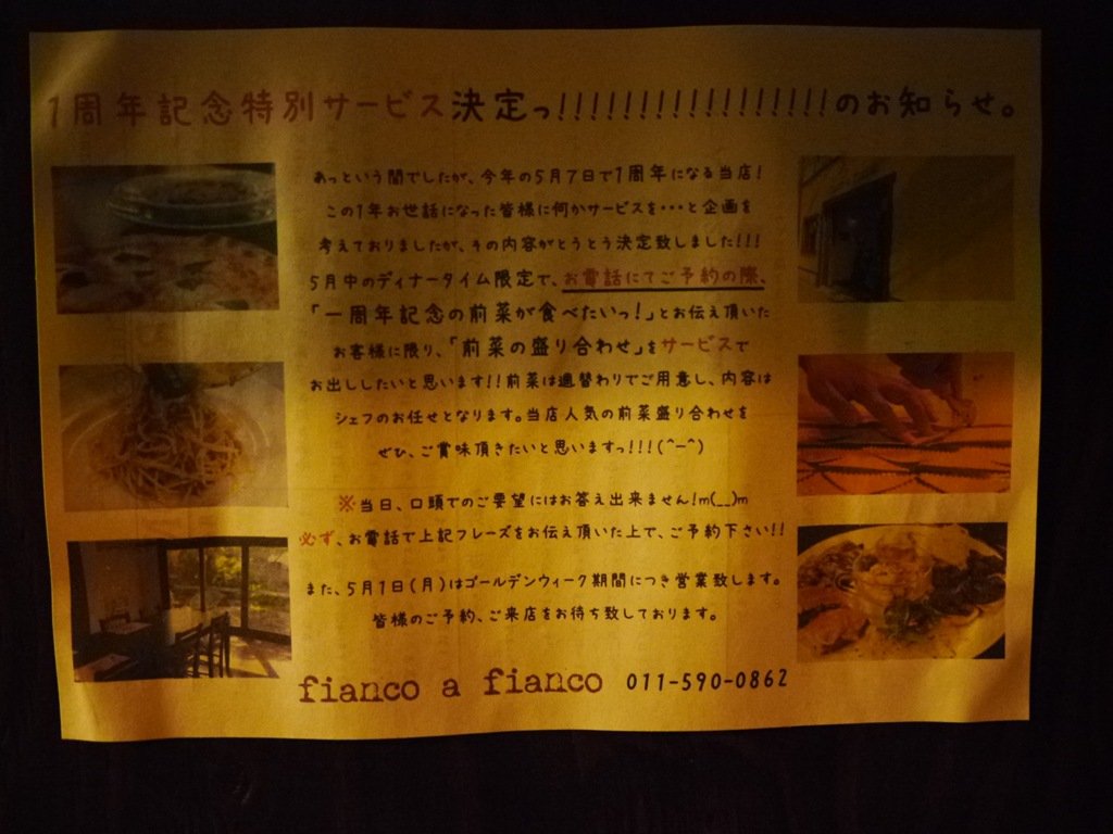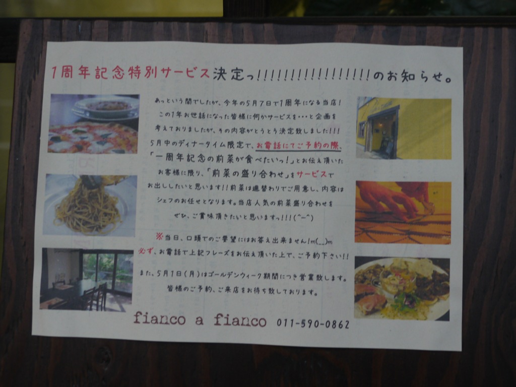 1周年記念は5月末まで、前菜盛り合わせは週変わりということでもう一回訪ねてみたいと思う、フィアンコアフィアンコの一周年