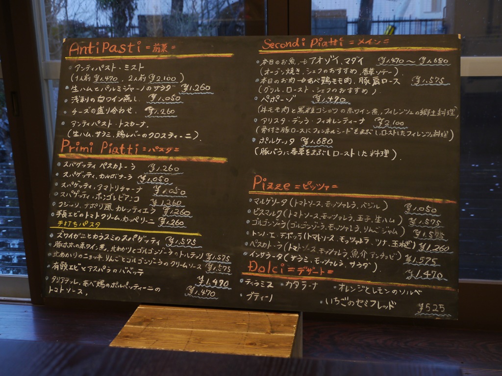 おすすめ黒板をしばらくみて迷いながら注文しました。メニューの奥の桜の花びらに目がいきます。