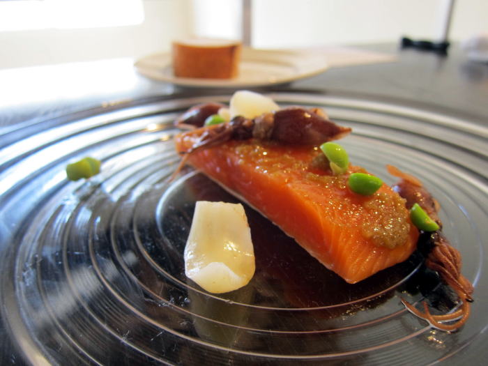 苫小牧から札幌にでてきた友人とランチに伺ったのは、三吉神社近くのフレンチのホフです。まずは前菜をいただきました。分厚く切ったサーモンの切り身がおいしくまわりのホタルイカも楽しい前菜です。