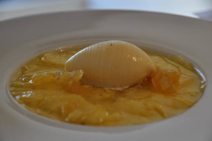 パイナップルのカルパッチョとブルーチーズのグラス うすくきったパイナップルがしきつめられた上の濃厚なブルーチーズのアイスとよくあっておいしいデザートです。
