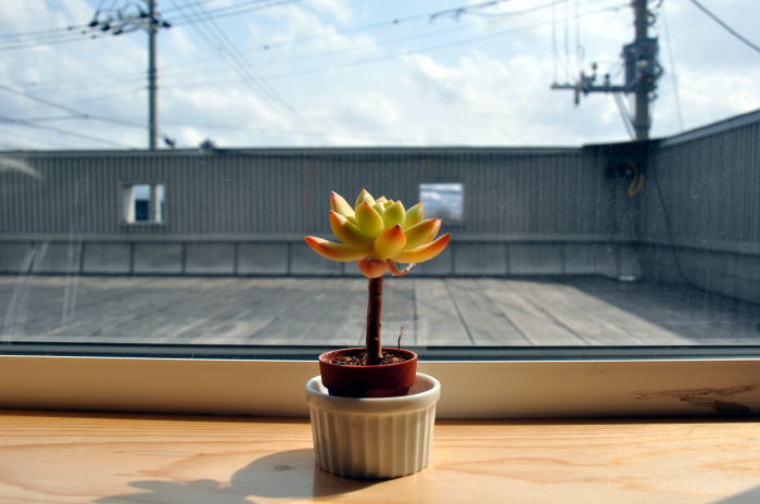 2階の窓の外にはウッドデッキがあって、ニッカの工場も見渡せます。小窓に飾られている多肉植物や雑貨コーナーにあった、大きなとっくり椰子もおしゃれです。
