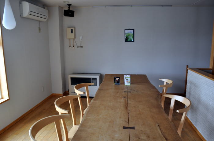 2Fの様子 手前には巨大な旭家具のダイニングテーブルがあってゆったりくつろげます。前にはウッドデッキのベランダがあって余市市内を一望できます。