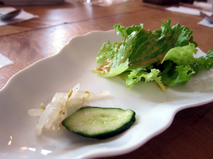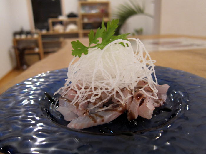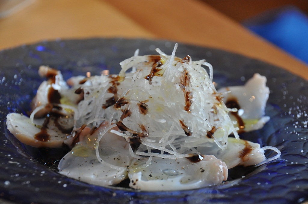 赤鰈のカルパッチョ なんとも新鮮でおいしいかれいで、バルサミコのソースがよくあっていておいしい一皿です。油ののったかれいはひらめよりもおいしいと思います。お酒が欲しくなる料理ですが、この日は運転手なので我慢です。