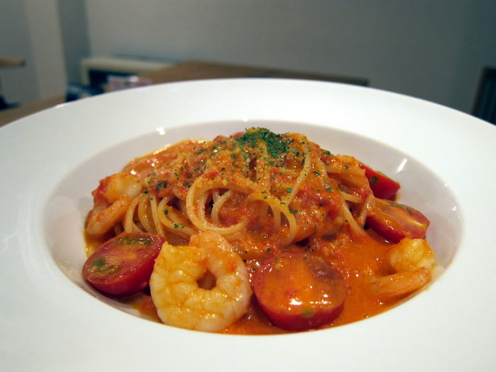 たのんだお料理が運ばれてきました。余市のへらがにを使った辛口パスタです。以前きたときと、狸小路のかね松さんではトマトクリームのパスタをいただきましたが、今回は塩味ベースのかにのうまみをよく感じられるピリ辛のパスタで、とてもおいしくて、後にしっかりとしたうまみの残るいい味でした。