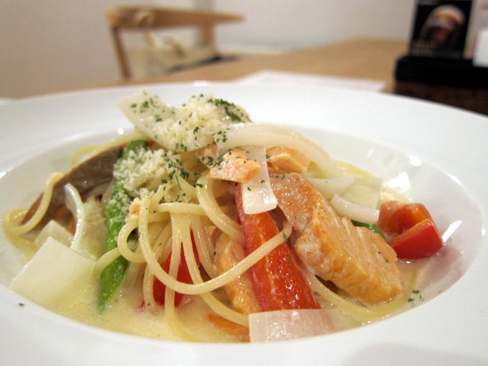 サーモンのクリームパスタ980円 たっぷり身厚のサーモンがたっぷり入ったきれいでおいしいパスタです。