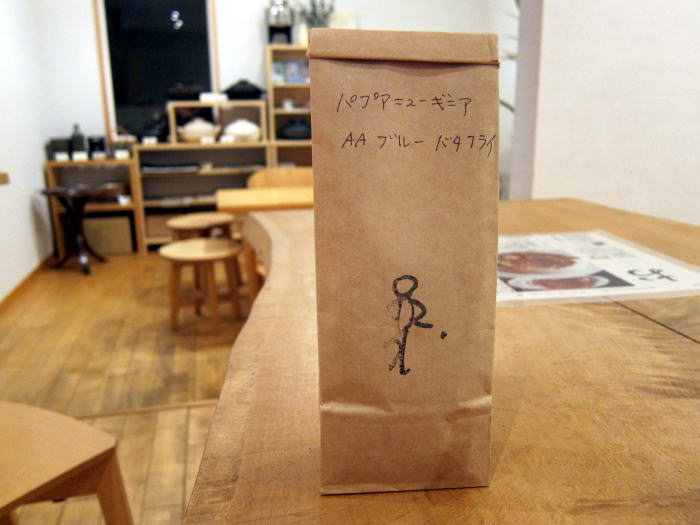 この日は、おすすめのパプアニューギニア、AAブルーバタフライという豆の自家焙煎したものを100gひいてもらいました。100g525円でお持ち帰りできます。