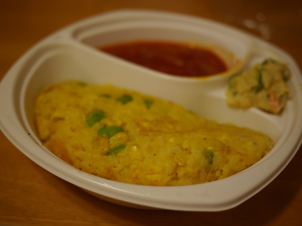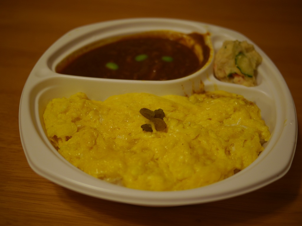 テイクアウトのベジフルカレー 500円 野菜をじっくり煮込んだカレーとふわふわ卵ののったごはんとポテトサラダ