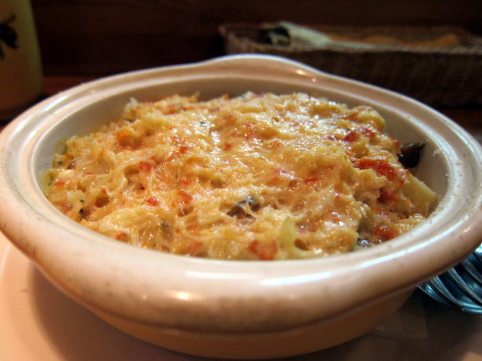もりあわせのお皿でも充分おなかは満足でしたが、もう一皿たのんだタラバガニとモッツラレラチーズのグラタンのお皿はカニとモッツラレラチーズがクリームとよくからみあってとてもおいしく、その中に入っているスナップエンドウの感触やじゃがいものうまみも楽しめておいしくいただきました。2杯目にたのんだしっかりとした味の飲みやすい赤ワインによくあっていて赤ワインを2杯おかわりしてしまいました。