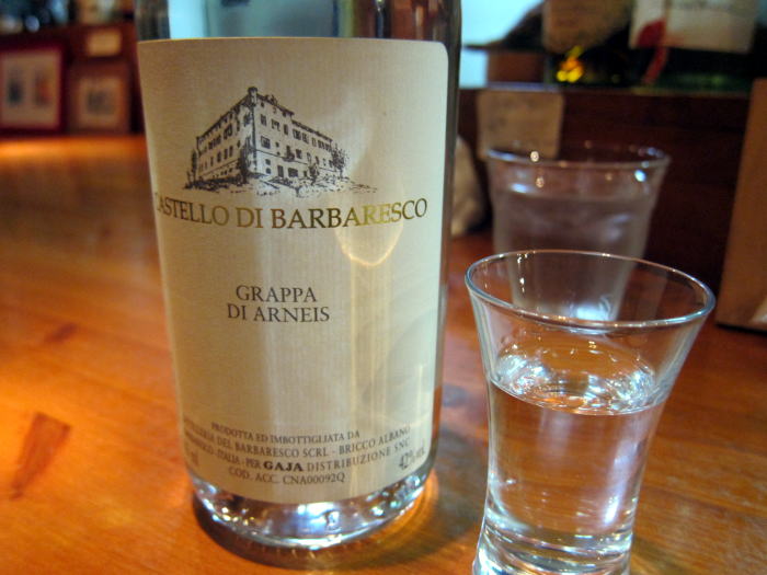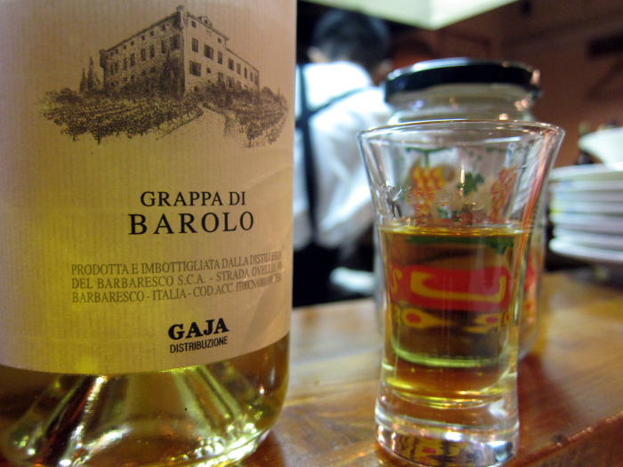 店主さんと蒸留酒の話をしていたため、食後酒にグラッパをいただきました。グラッパはうまみのあるおいしいお酒ですが、かなりきついお酒で一気に酔いがまわりました。良い気持ちでお店を後にしました。