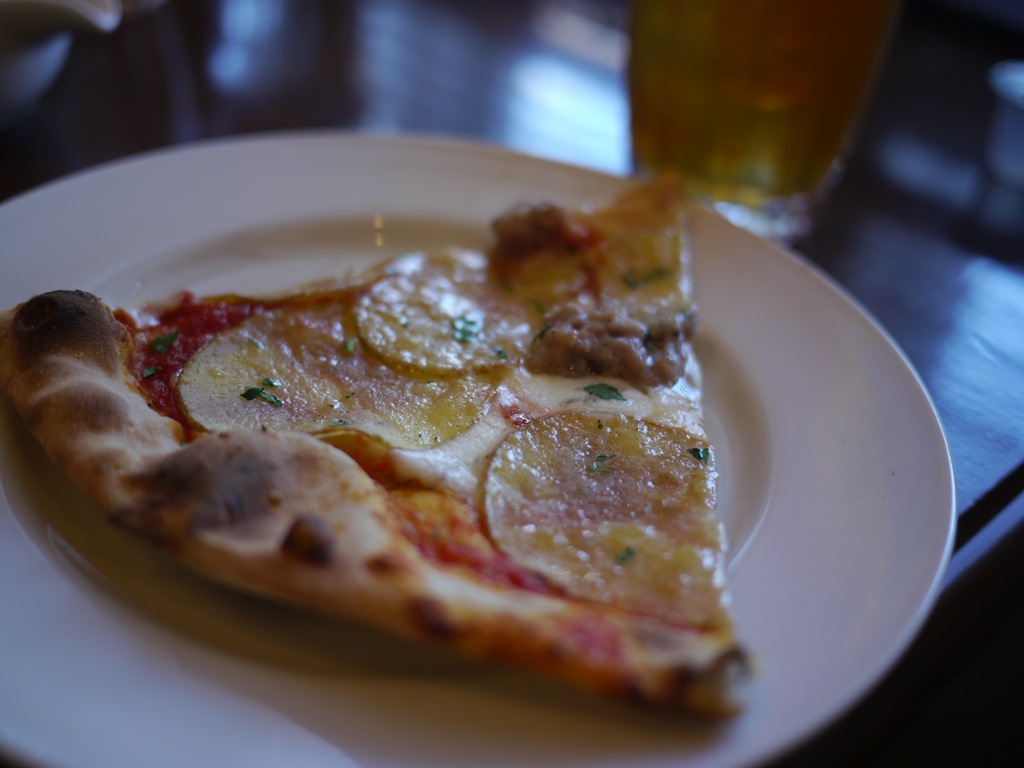 洋菓子と新釜ピッツア ラヴェリテ 、車でこの近くを通るときには、ついつい立ち寄ってしまいます。広い駐車場がとても便利、おまけに薪の香ばしいピザの焼き上がりがとても楽しみ。この日はシェフの気まぐれピッツア1380円をお願いしました。自家製ソーセージときたあかりのトマトピッツア、まるでりんごパイのようにきれいに敷き詰められたきたあかりのスライスをみて、とても気まぐれではできないと思いました。