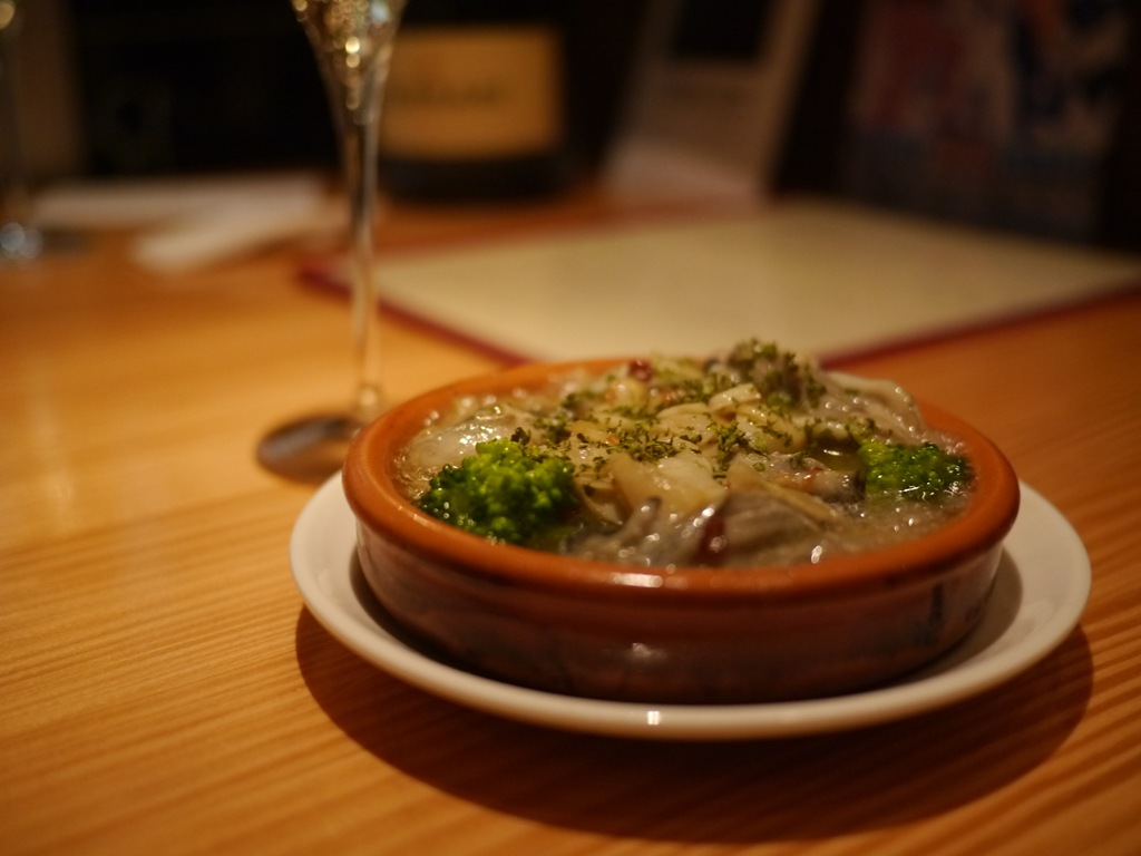 壁の黒板を見ると料理も充実、最初にたのんだのはカキアヒージョ、ガーリックの効いたオイル煮これはおいしい、バルらしい料理です。