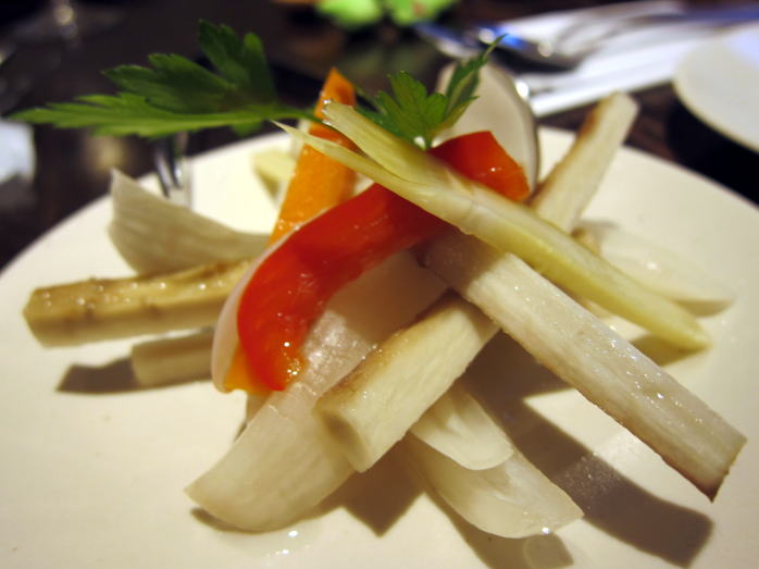おいしいピザを食べたいということで、この日は円山のピアチューレにいきました。飲み物と一緒にきたのは自家製ピクルス ごぼうのしゃきしゃき感がなんともいえません。