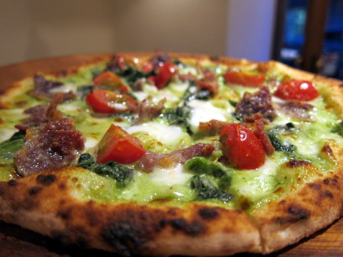 スピナーチ 初めて食べてみたピザでしたが、たのんで正解のおいしさでうれしくなりました。ジェノベーゼソースの味とイタリア産ハムのうまみがよくあっていて満足のおいしさです。