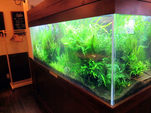 店の奥には水族館のような超大型水槽が設置されていて、みごとな水草の中をきれいな熱帯魚が泳いでいる姿をみることができます。水槽をみながら、食事のできる席もありました。