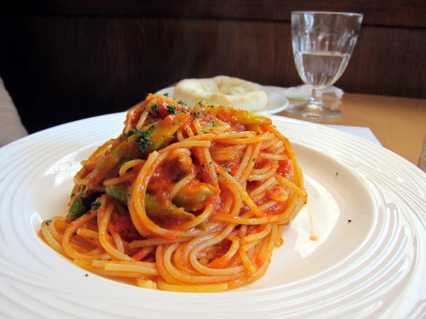 同行者がたのんだパスタです。トマトソースのおいしいパスタです。パスタのボリュームもたっぷりで食べ応えのあるパスタです。