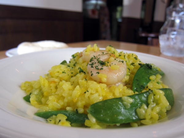 サフランの黄色がきれいで、海老のピンクとエンドウの緑が映える美しい一皿です。味も上品なおいしさでお米の感触をたのしめました。